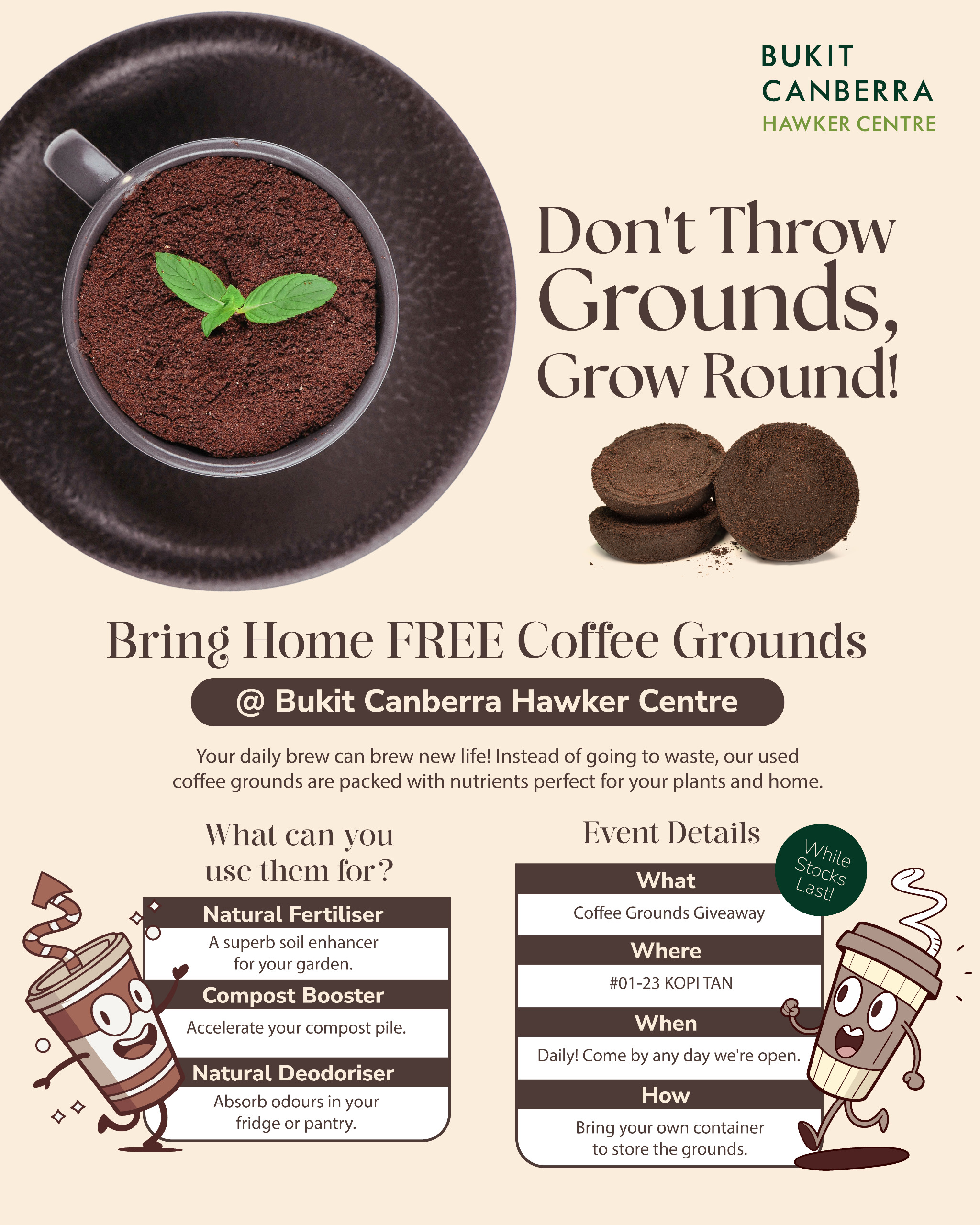 Bring Home FREE Coffee Grounds @ Bukit Canberra Hawker Centre! Your daily brew can brew new life! Instead of going to waste, our used coffee grounds are packed with nutrients perfe